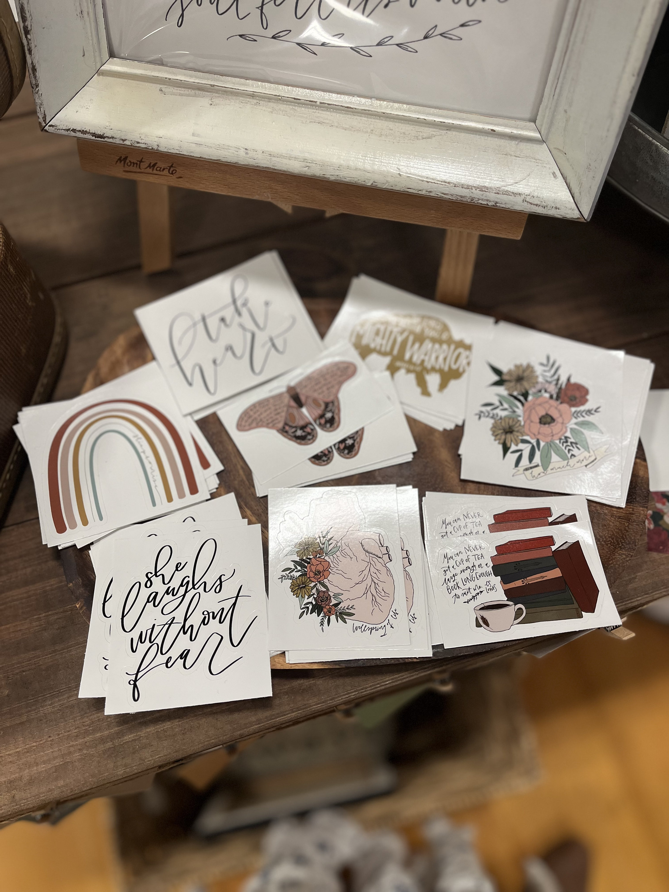 Each of these stickers is a 3x3 kiss cut white sticker with a hand drawn, hand lettered design.